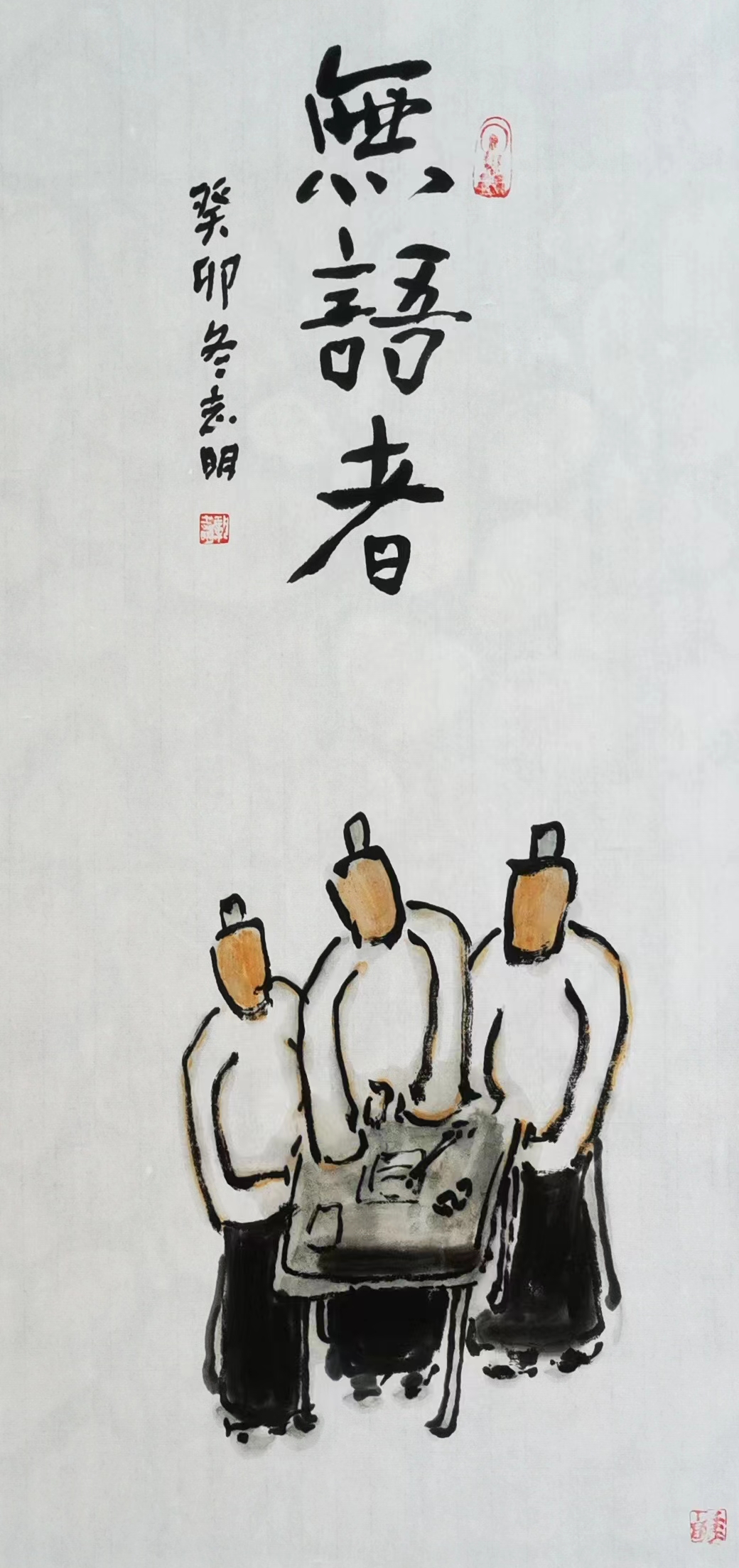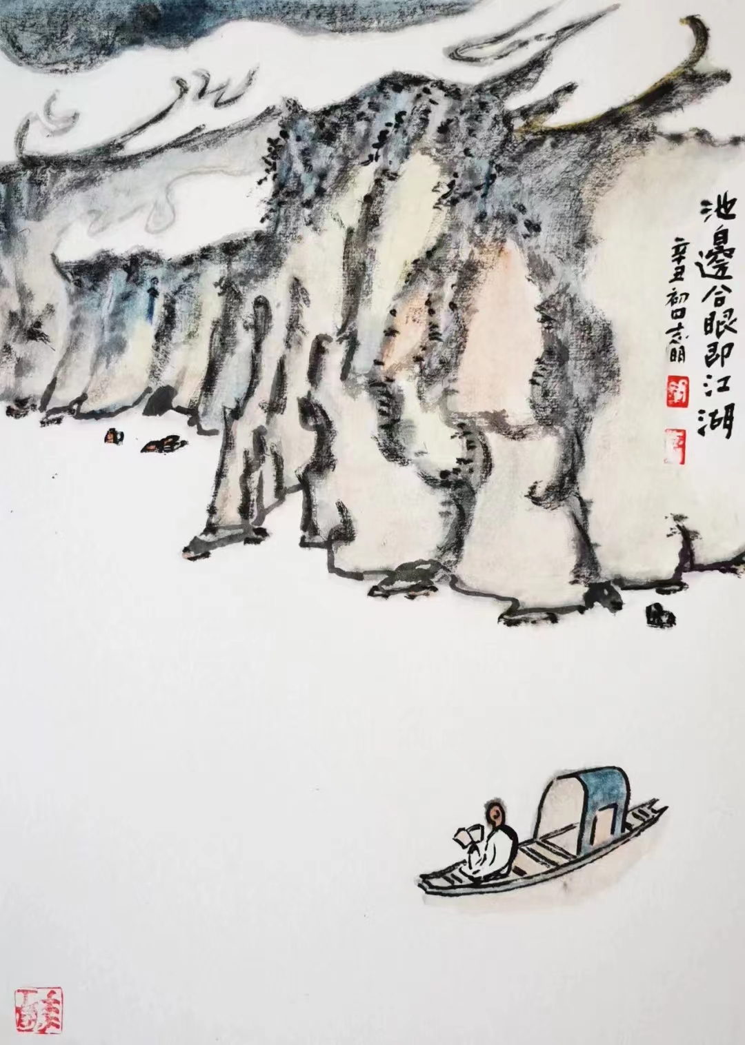 記得那一年的端午節,鞏志明發來短信,是他寫的一首詩:綠粽黃酒聚江邊,白帆紅燭祭屈原。三千清淚流不得,九萬渾念飄上天。誰有郁悶誰散淡,何謂圓滑何忠奸。十丈風塵古今在,談笑真偽化孤煙。2017年,我遷新居,鞏老師為我寄來小品畫《福到眼前》,我很喜歡,并懸掛至新居玄關。這些年,鞏志明老師常做影展畫展策劃及影評講座,自已也臨池不輟,水墨丹青,寄情抒懷,他的文人小品有思想性、有創造性。雖畫的是松風明月,小舟流水或遠古人物,但都寄托了他當下的心境,以消塊壘。誠如有人評論他為“吾師真文人,畫亦真性情!”他不僅只是身居畫室的怡情文人,他亦是心憂天下的豪俠。面對世間不平事,他也是激揚文字,揮斥方遒!在功利的當下,鞏志明尤其顯得難能可貴!